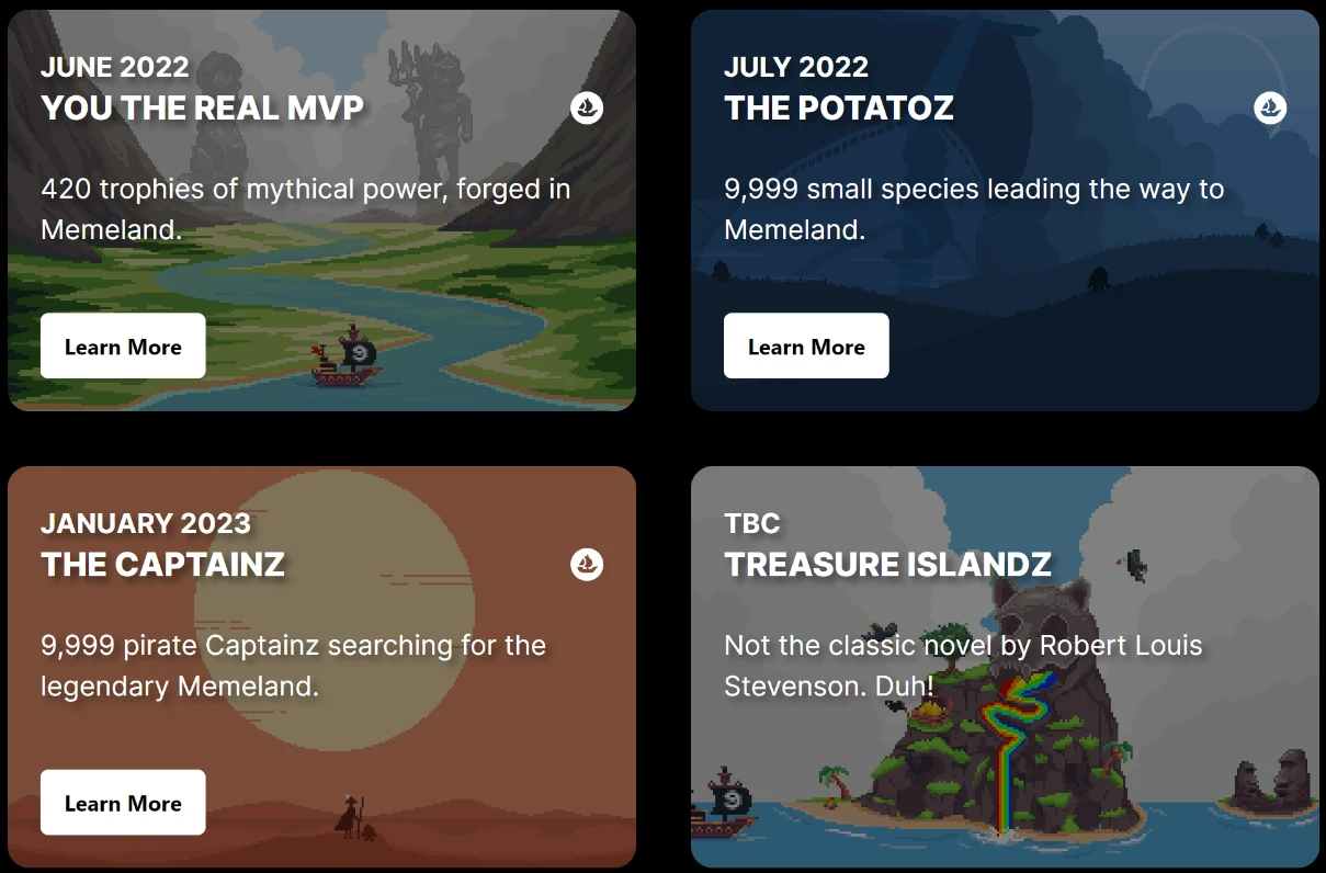 Memeland 从去年开始,已经发行三个 NFT 系列,分别是 You the Real MVP、The POTATOZ 和 The CaptainZ(“船长”系列)。三个 NFT 系列的成功发行为 Memeland 带来不错的热度,并且为项目后续发展提供坚实的社群基础。