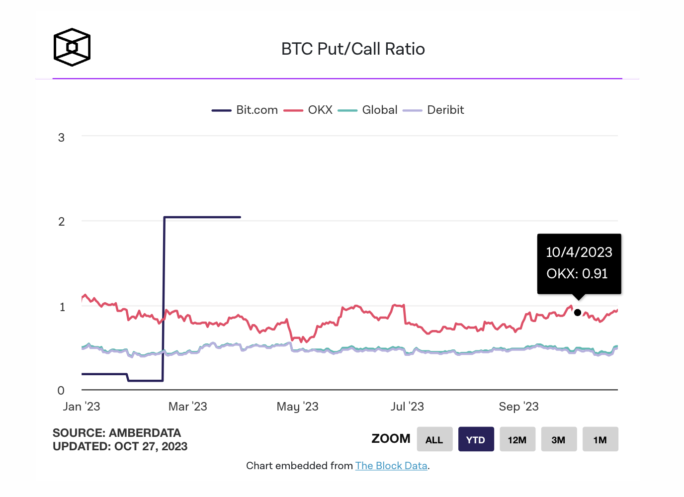 看跌/看涨期权比率低于1意味着看涨期权交易量超过看跌期权交易量,表明市场情绪看涨。