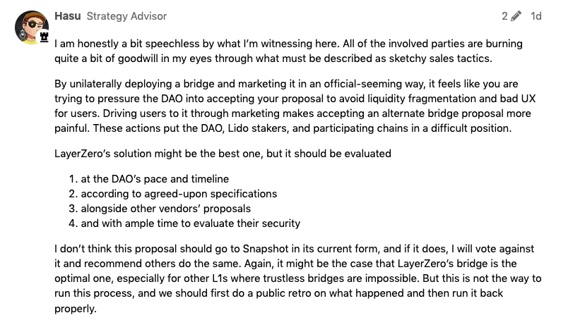 Lido 战略顾问 @ Hasu 则直呼“无语”,先是单方面完成部署,再以官方渠道进行营销,这感觉就是在迫使 Lido DAO 接受提案一样。即便 LayerZero 的方案本身没有问题,但它也需要在社区之内得到充分讨论,并允许社区从多个方案中做出筛选。这件事在推进顺序上存在错误。