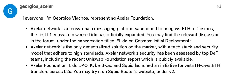 率先发难的除了前文提到的 Across Protocol 的创始人 Hart Lambur 之外,还有 Axelar Network 的联合创始人 Georgios Vlachos ,其在 LayerZero 的提案讨论贴下方提出了 Axelar Network 所给出的竞争方案,并已获得部分社区成员的支持。
