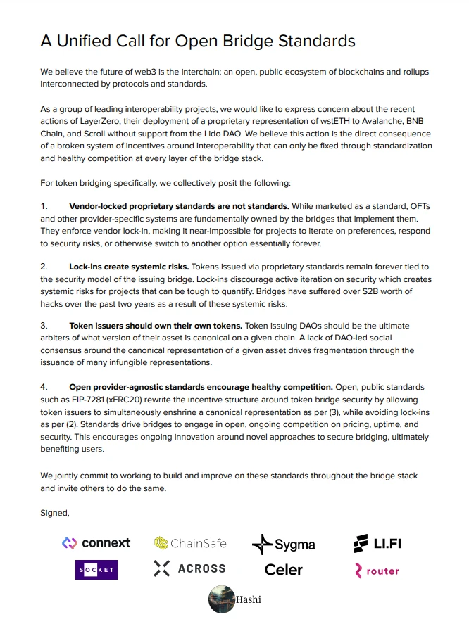 而在今日凌晨, Connext Network、 ChainSafe 、Sygma、Li.Fi、 Socket 、Across Protocol、 Celer 、 Router 等八大项目联合发文,怒喷 LayerZero “不讲武德”,并呼吁构建开放型的跨链桥接标准。