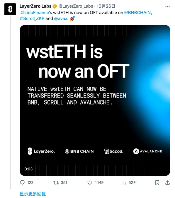 10 月 26 日,跨链互操作性协议 LayerZero 于官方 X 账户宣布,已推出了针对 Lido Finance 流动性质押衍生代币 wstETH 的“全链版本”(OFT),允许利用 LayerZero 的通信协议跨以太坊、 Avalanche 、BNB Chain 和 Scroll 自由转移该代币。