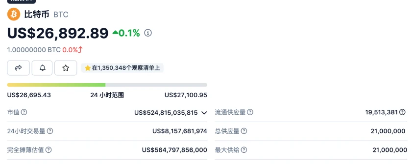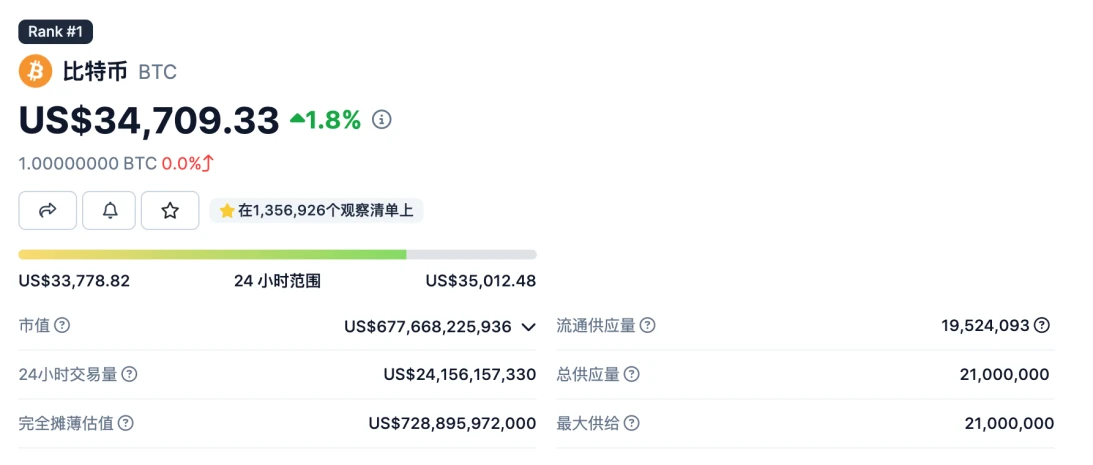 BTC 总供应量固定为 2100 万枚,当前的流通量为 1951 万个,占总供应量比例约为 90% 。