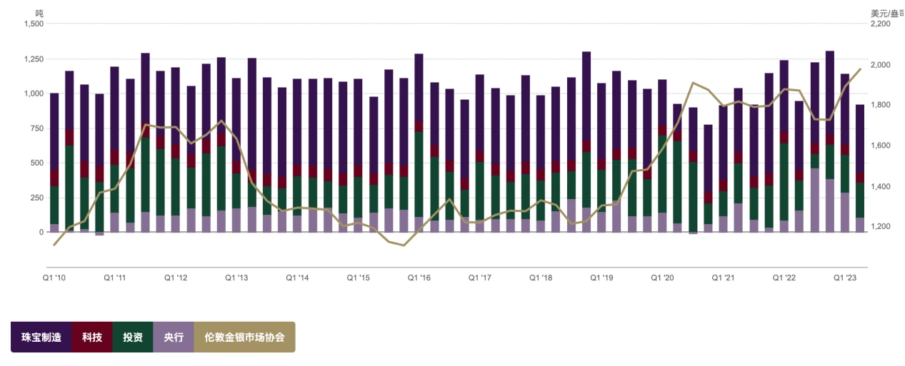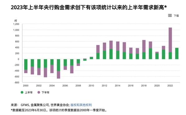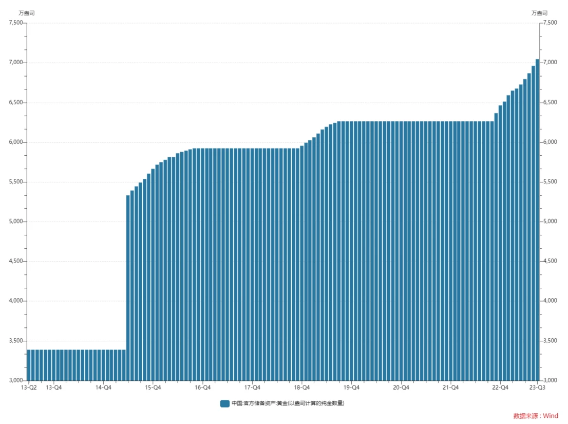 根据世界黄金协会的数据,从 2022 年下半年开始央行的购金需求有剧烈上升, 2022 年下半年总计购金 840.6 吨,为 2021 年全年总量的 1.8 倍。今年上半年央行购金需求相对去年下半年有所汇率,但也高达到 387 吨,创下自 2000 年以来有该项统计以来的新高。其中土耳其因政治局势一度不稳国内黄金需求旺盛,政府临时禁止部分金条进口并向国内市场出售黄金,不代表土耳其长期黄金战略的转变。总体上二季度土耳其的售金并未削弱整体央行黄金需求的积极趋势,其中购金数量最大的是中国大陆,一二季度分别购入 57.85 和 45.1 吨。10 月 13 日数据, 9 月末中国黄金储备报 7046 万盎司,环比增加 84 万盎司,为连续第 11 个月增加,过去 11 个月中国央行黄金储备累计增持规模达 782 万盎司。历史上中国央行购金呈现战略性特征几乎不抛售。