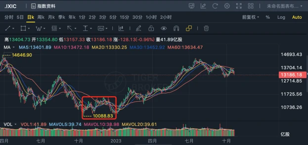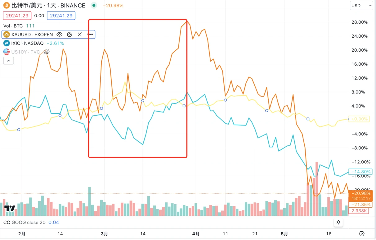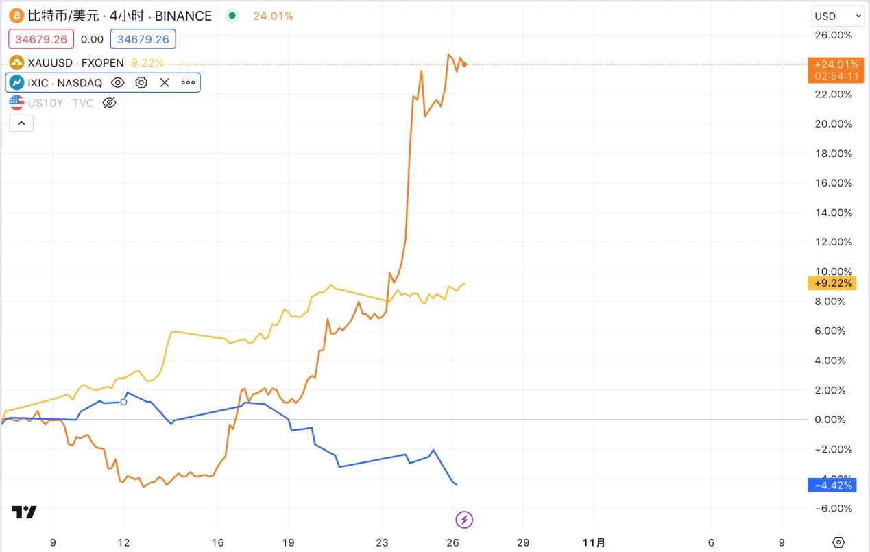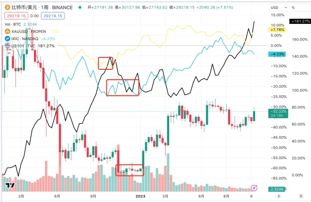 见底之后黄金最先启动新一轮行情,从 11 月初开始连续上涨,高点出现在 5 月 4 日 2072 美元,较低点上涨 28% 。而 BTC 和纳斯达克指数的行情启动比黄金晚了 2 个月, 2023 年开始 BTC 和纳斯达克指数又再次同步开启上涨行情,BTC 与纳指高点同步出现在 7 月中旬,BTC 最高来到 31500 左右,较低点上涨接近 1 倍,纳指最高来到 14446 ,较低点上涨 44% 。