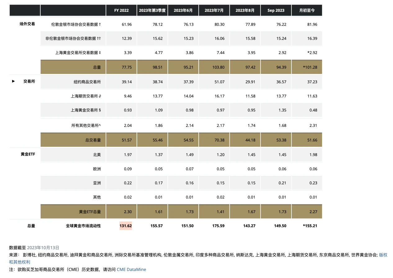 黄金是世界上流动性最好的资产之一, 2022 年的日平均交易额为 1316 亿美元。其中主要的交易场所有伦敦 OTC 市场、美国期货市场和中国市场。伦敦 OTC 市场始于 1919 年,属于黄金现货 OTC 市场,是黄金交易的中心,伦敦金银市场协会 (the London bullion market association,LBMA)每天产生 2 次黄金参考价格(伦敦时间上午 10 ∶ 30 及下午 3 ∶ 00)作为市场参与者进行交易的基准;纽约商品交易所(COMEX)的黄金市场是目前世界上最大的黄金期货市场;上海黄金交易所(Shanghai Gold Exchange,SGE)于 2002 年 10 月 30 日正式开业,为中国黄金市场提供了现货交易平台;上海期货交易所(Shanghai Futures Exchange,SHFE)期货交易对上海黄金交易所的现货交易进行了补充。