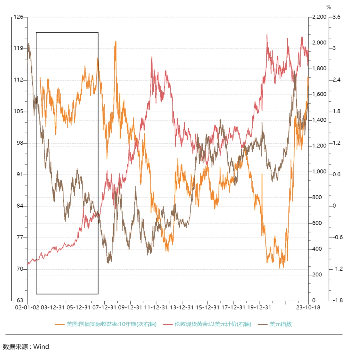 2022 年四季度到 2023 年初,美国 10 年期国债实际收益率保持震荡没有出现大幅波动,但金价从约 1600 美元的低点升至 2000 美元/盎司,金价偏离了美国长期收益率的掣肘。而从 2022 年 10 月到 2023 年 1 月,由于中国疫情放开后的经济复苏预期和欧洲经济反弹等原因,美国以外的增长势头更为强劲,导致 DXY 下跌了近 9% ,这段时期黄金体现出主要跟随 DXY 的上涨。