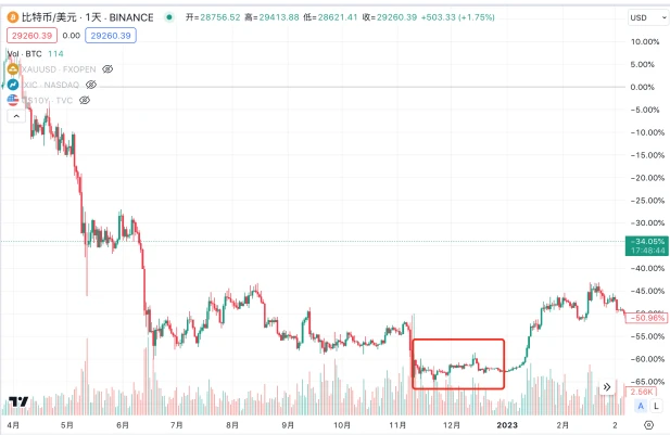 4 月份开始,伴随着加息 BTC 和纳斯达克指数同时开启了较长时间的下行期间,黄金价格在短暂上涨后于 4 月 19 日亦开启长期的下行区间。纳斯达克指数在 2022 年 10 月见底约 10000 点,从加息开始累计跌幅 28% ;黄金在 9、 10 月份见底 1615 美元,从加息开始累计跌幅 16% ;BTC 在 11 月份见底约 16000 美元,从加息开始累计跌幅 66% 。