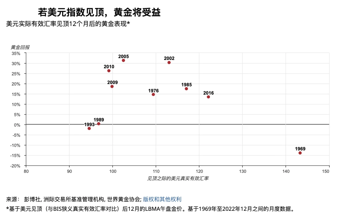 历史上美元指数在触顶 12 个月后 80% 的时间里黄金收益率为正值(平均收益率+ 14% ,中位数+ 16% )。