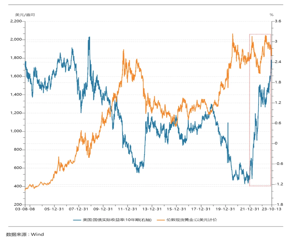 黄金是无息资产,美元是生息资产,美元收益率以及通胀预期是驱动黄金价格变化的两股力量,美国的实际利率(名义利率-通货膨胀预期)即是持有黄金的机会成本,理论上两者呈负相关的关系。从另一个角度美国实际利率代表了在美元体系中所能够实现的真实回报率水平,是可以用来衡量美元信用强弱的指标。