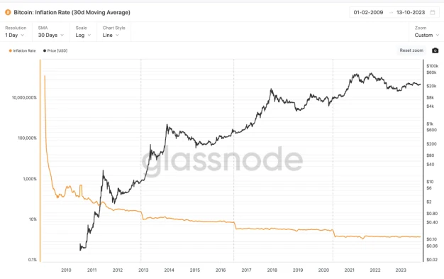 目前 BTC 的通胀率大概在 1.75% 左右,黄金每年的通胀率在 2% 左右,两者较为接近。由于比特币减半的设置未来比特币 BTC 的通胀率将会显著低于黄金,最近一次(2020 年)减半将每个区块中发行的比特币数量从 12.5 个减少到 6.25 个,下一次减半预计会发生在 2024 年的 4 月底。