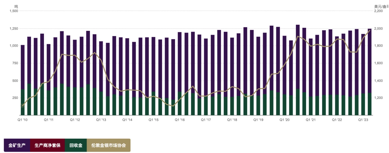 全球黄金每年的新增供应量较为稳定, 2016 – 2022 年维持在 4800 吨左右。由于黄金不易损耗,消费领域的黄金仍以某种形式存在,可以通过回收再次进入循环进供应。因此黄金供应来自于矿山生产及黄金回收两部分。2022 年黄金回收总量 1140.6 吨,矿山生产总量 3626.6 吨,约有四分之三供应来自于金矿山的开采,四分之一的供应来自于黄金回收。可以从下图发现黄金的供给稳定,多年来未出现趋势性大波动,因此黄金相对刚性的供给对价格的影响较小。