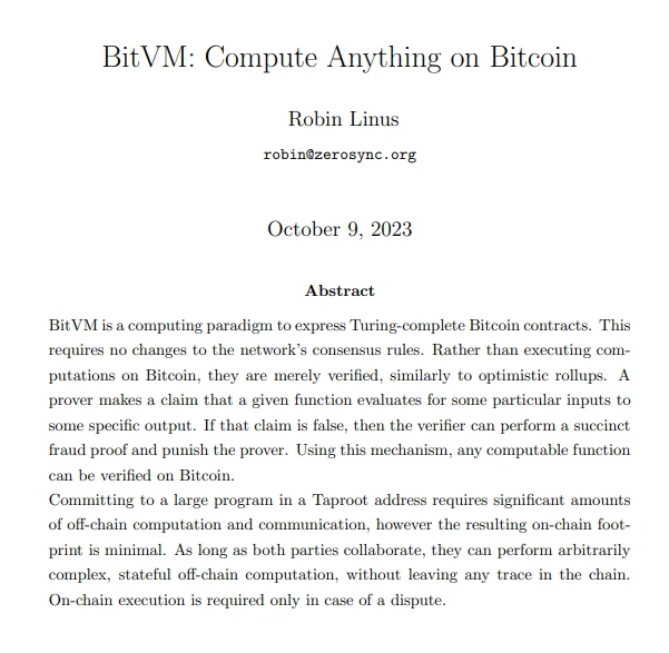 近期 ZeroSync 项目负责人 Robin Linus 发表了一篇名为: 《BitVM:Compute Anything On Bitcoin》的白皮书引发了大家的热议,BitVM 是 “比特币虚拟机 Bitcoin Virtual Machine ” 的缩写。它提出了一种在不改变比特币网络共识的情况下可实现图灵完备的比特币合约解决方案,使任何可计算的函数都可以在比特币上进行验证,允许开发者在比特币上运行复杂的合约,而无需改变比特币基本规则。