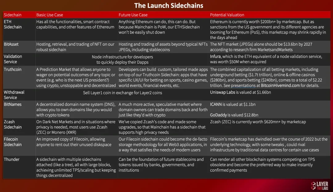 通过 sidechains 来创建出符合自身应用场景需求的区块链应用程序,且于 Drivechain 将 sidechains 视为第二层来完成扩展,从而避免比特币区块 1 MB 大小的限制。当前已经有 7 条基于 BIP-300 的 Sidechain 在推进之中且在持续吸引更多的比特币社区和爱好者的加入,分别为(为简述仅做例句,详情见【 6 】):