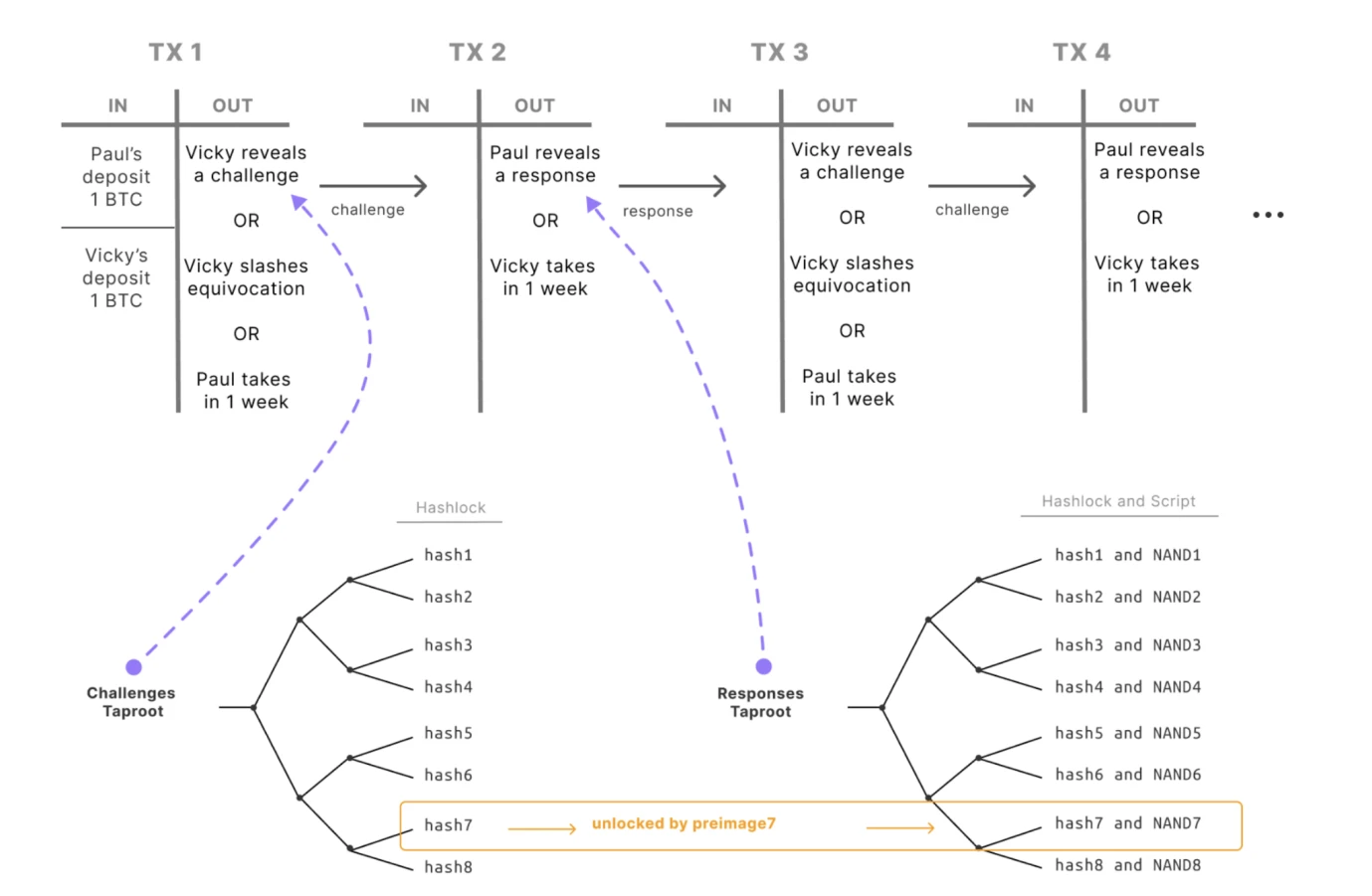 链下计算和链上证明:在不改变比特币共识的情况下 BitVM 毋庸置疑需要将大量的计算和扩展转移到链下完成,以此提升灵活度。而饱受争议的链上证明,严重者和证明者之间会出现一个类似 Optimistic Rollup 采用的一种数据有效性的欺诈证明的验证方式来确保安全。而 BitVM 特别之处是通过 Taproot 地址矩阵或 Taptree 实现了类似二进制电路的各类程序指令,相互组合以完整合约执行【 1 】。