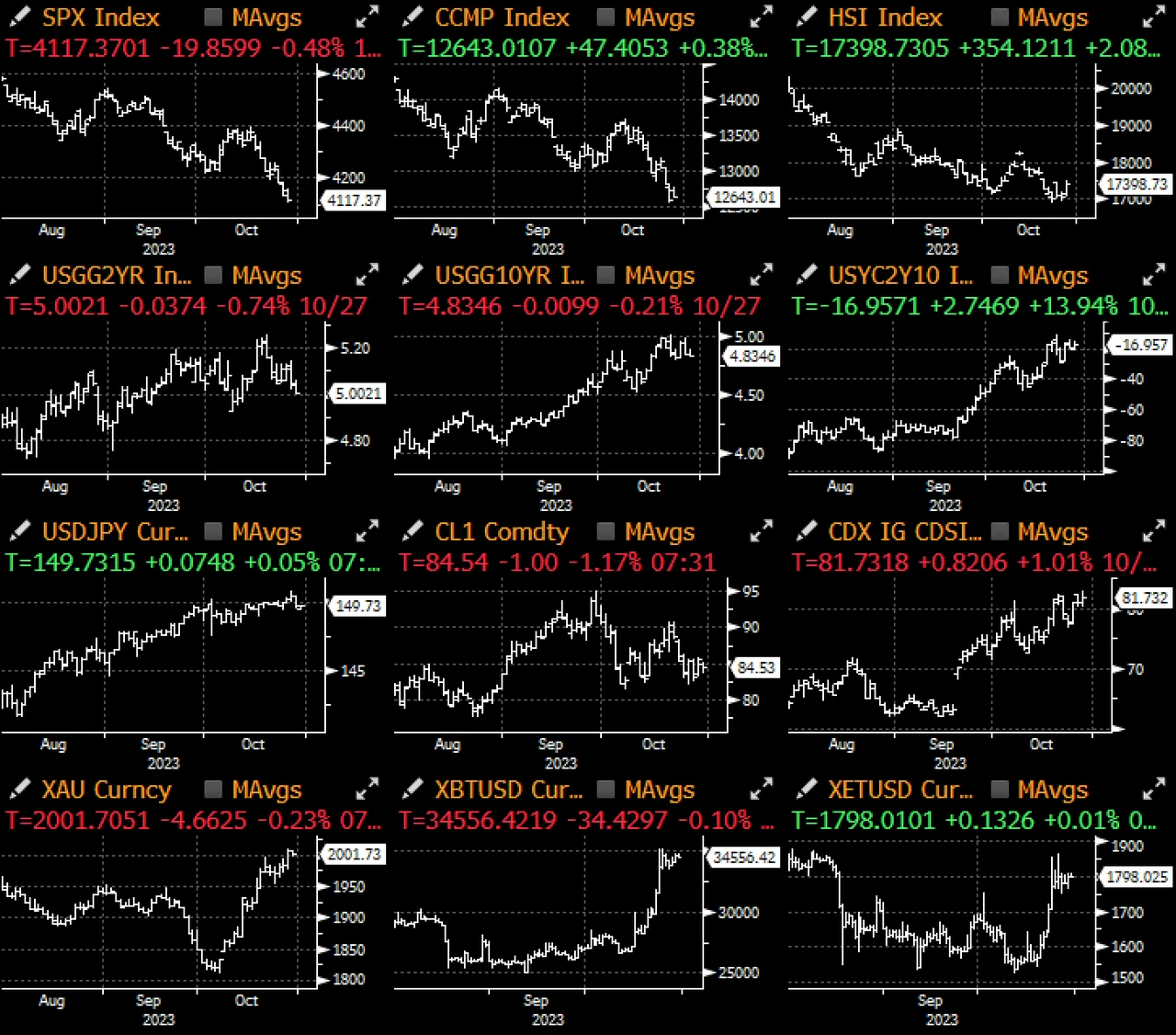 在股市方面,根据高盛数据, 49% 的 SPX 企业已经公布了第三季财报,其中包括 4 家科技巨头;虽然大多数企业的营收和 EPS 与前几季一样优于市场预期,但由于利率上升、消费趋势走软以及 2024 年宏观和政治环境的不确定性,企业管理层均下调了未来盈利指引;此外,与过去几个季度相比,投资者的预期也相应上升,仅是盈利/营收超出预期已经不足以保证当天股价的强劲表现。
