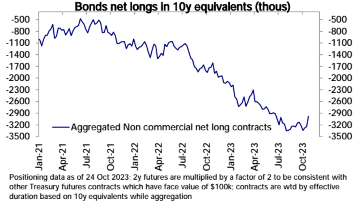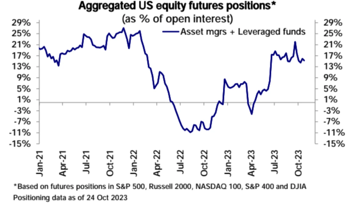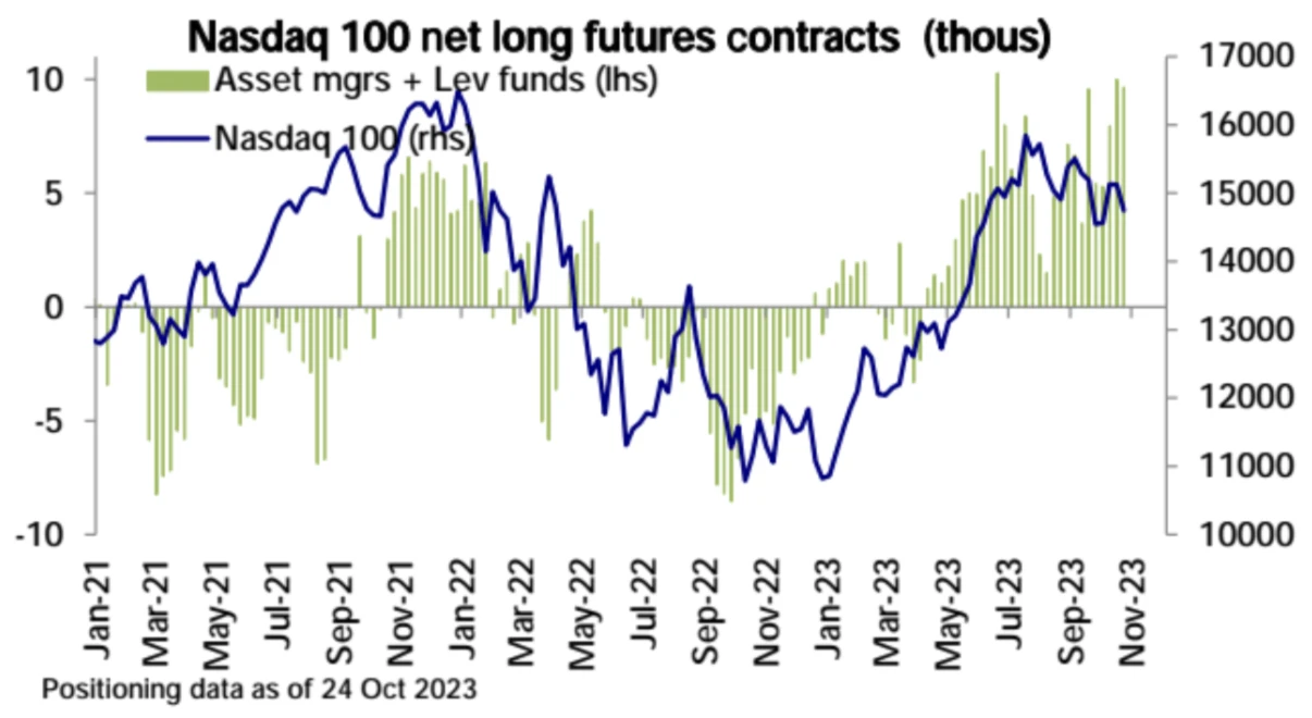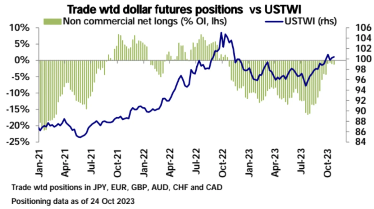 本次没有新的经济预测发布,声明也不太可能较 9 月的有多少变化,所以人们的注意力将是新闻发布会。预计鲍威尔将再次提到金融条件的紧缩(市场利率走高)是货币政策保持不变的原因(鸽派喜欢的信息),也就是大概率鲍威尔不会再释放边际 higher 的信息,但是要关注鲍威尔是否对 longer 松口,也就是 9 月点阵图传达的政策会在明年年底之前保持限制性的时间点是否可能提前。