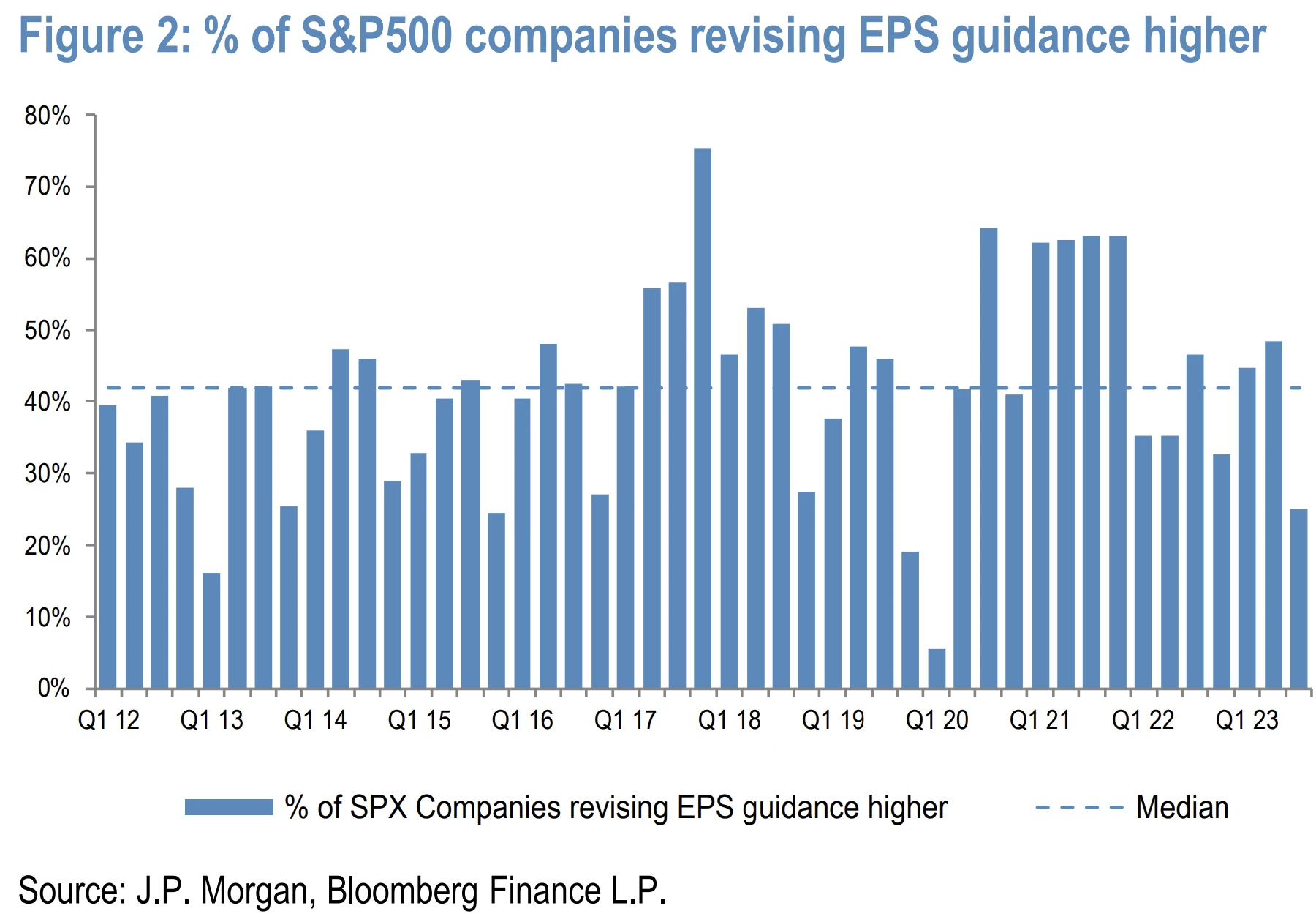高于平均水平的公司警告利润下滑,标志出销售/需求走弱、宏观环境恶化和通胀压力,提高下一年 EPS 指引的公司比例创 2020 年以来最低。