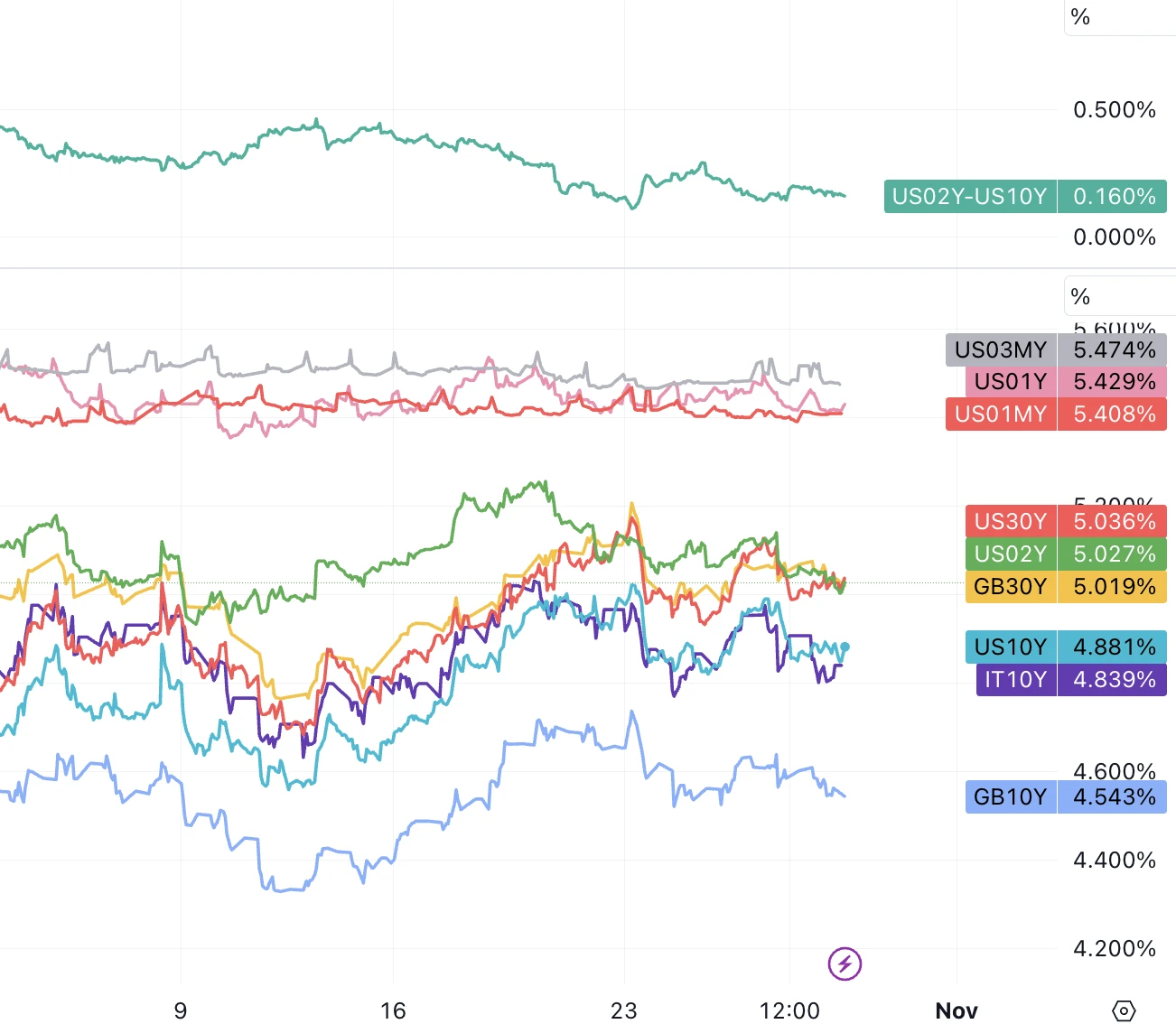 1 号下午 2 点,美联储 FOMC 预计将宣布决定将利率稳定在 5.5% 。在美联储主席鲍威尔最近表示,长期收益率上升降低了“边际”进一步收紧政策的必要性,市场可能借由此次会议押注美联储加息可能会结束,例如利率期货市场目前预期年内再加息的概率只有 19% ,一周前是 20% ,一个月前是 31% 。