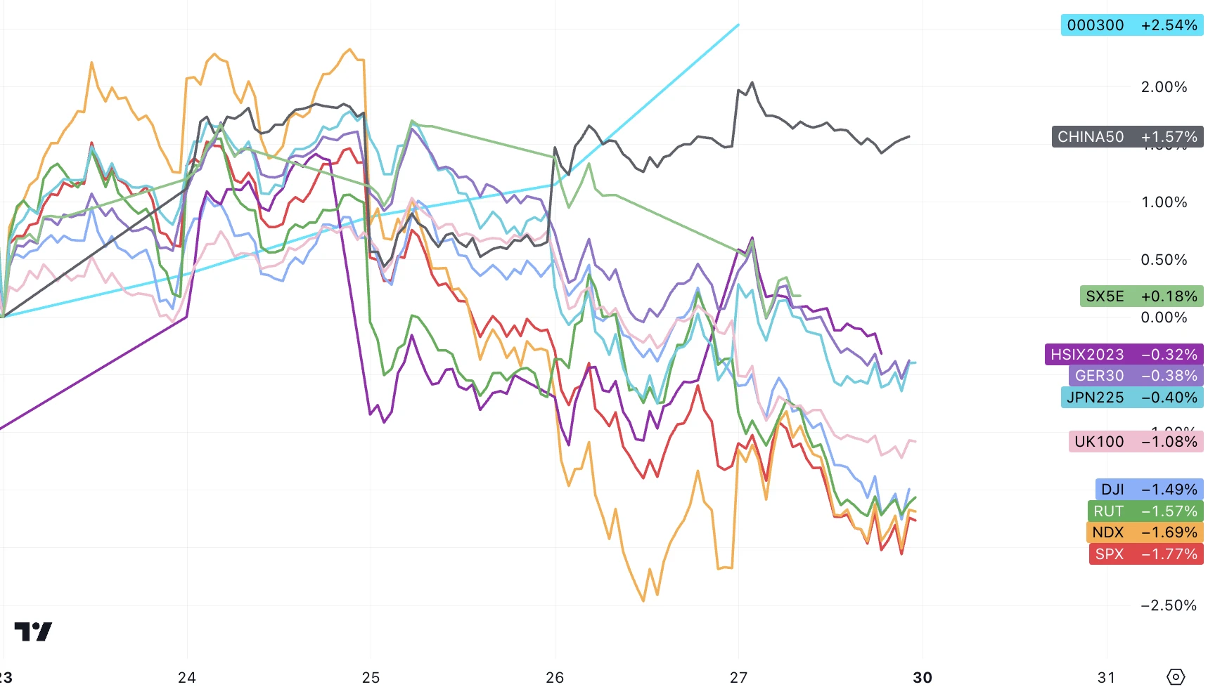 发达国家股市上周短暂反弹后下跌,美股跌幅尤为大,中国股市终于反弹(三个月来最大)影响市场的主要事件包括中国突破财政预算红线(市场期待已久的中央加杠杆),强劲的美国第三季度 GDP 增长报告、温和的 PCE 通胀发布、仍处于高位的 10 年期国债收益率以及被解释为“不够好”的大盘科技股(尤其是谷歌和 META)的财报、鸽派的 ECB 会议、以色列正式开始地面行动。
