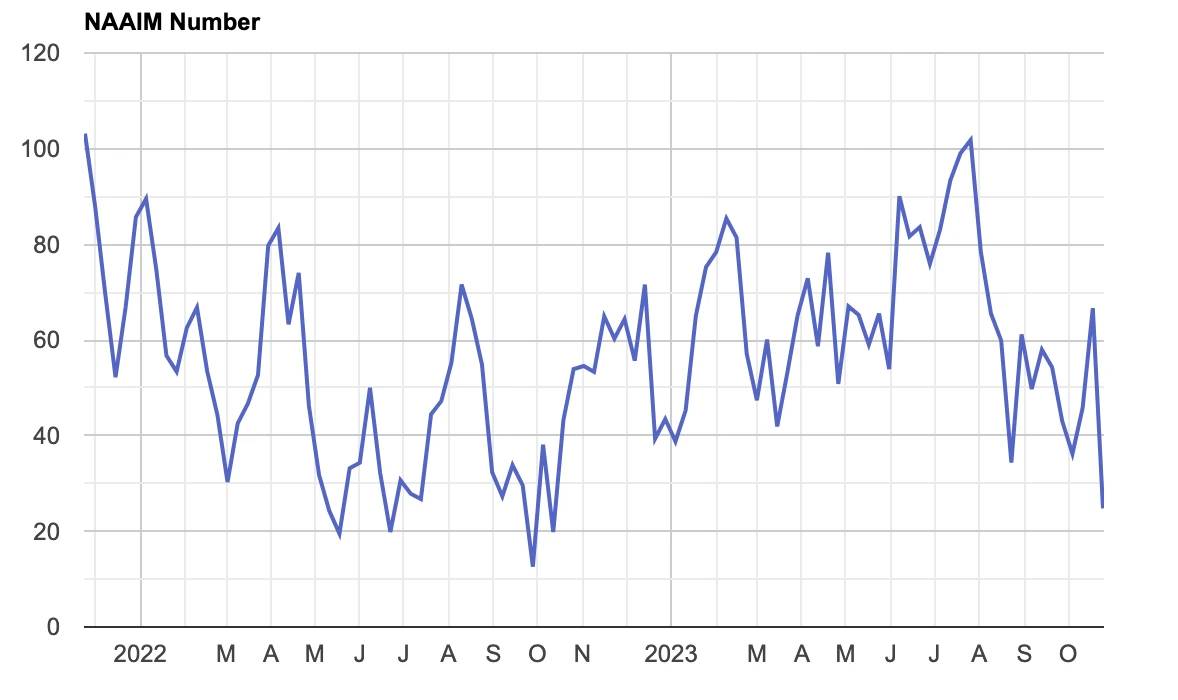 美国主动投资经理协会(National Association of Active Investment Managers)敞口指数,代表该协会会员报告的美国股票市场的平均敞口。上周大幅度跳水(67% -25% ),降至去年 10 月以来最低水平