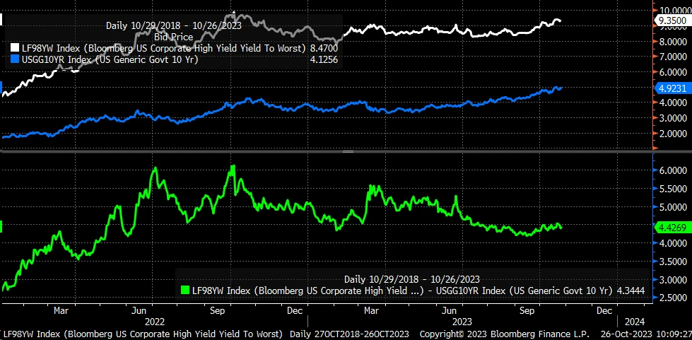 与 2022 年 10 月利差峰值约 6.1% 相距甚远,并且最近两个月债券大熊市里几乎没有扩大。除非市场现在认为国债的风险上升高于垃圾债券,否则高收益债的收益率应该继续向上定价。