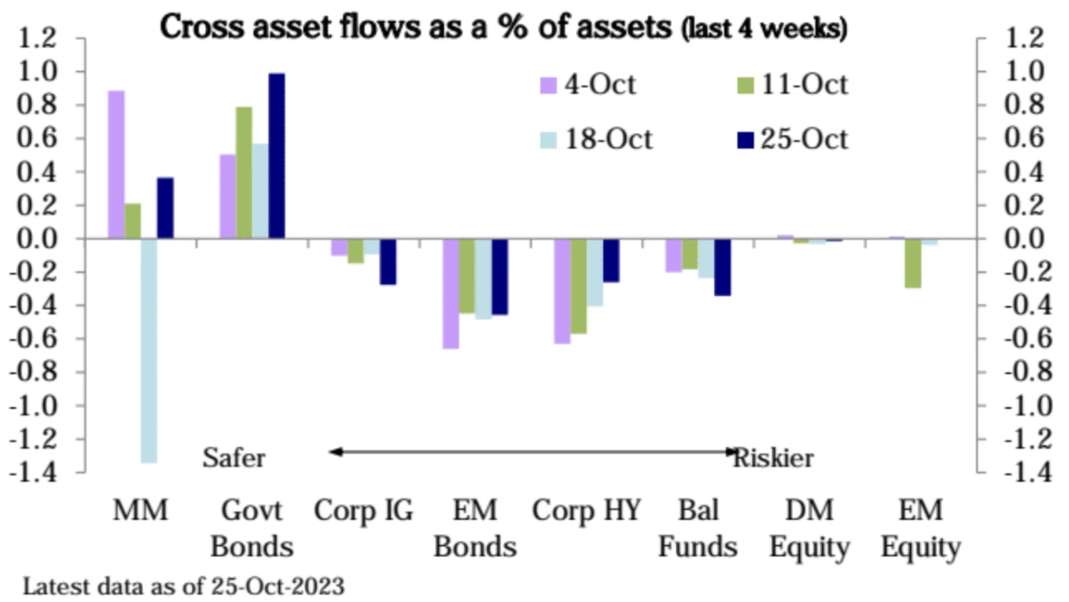股票基金连续第三周流出,主要来自欧洲和全球基金;债券基金连续第三周流入,主要流向政府债;货币市场基金转为中等幅度流入(290 亿美元)看起来前一周创纪录的流出是一次性因素导致的:
