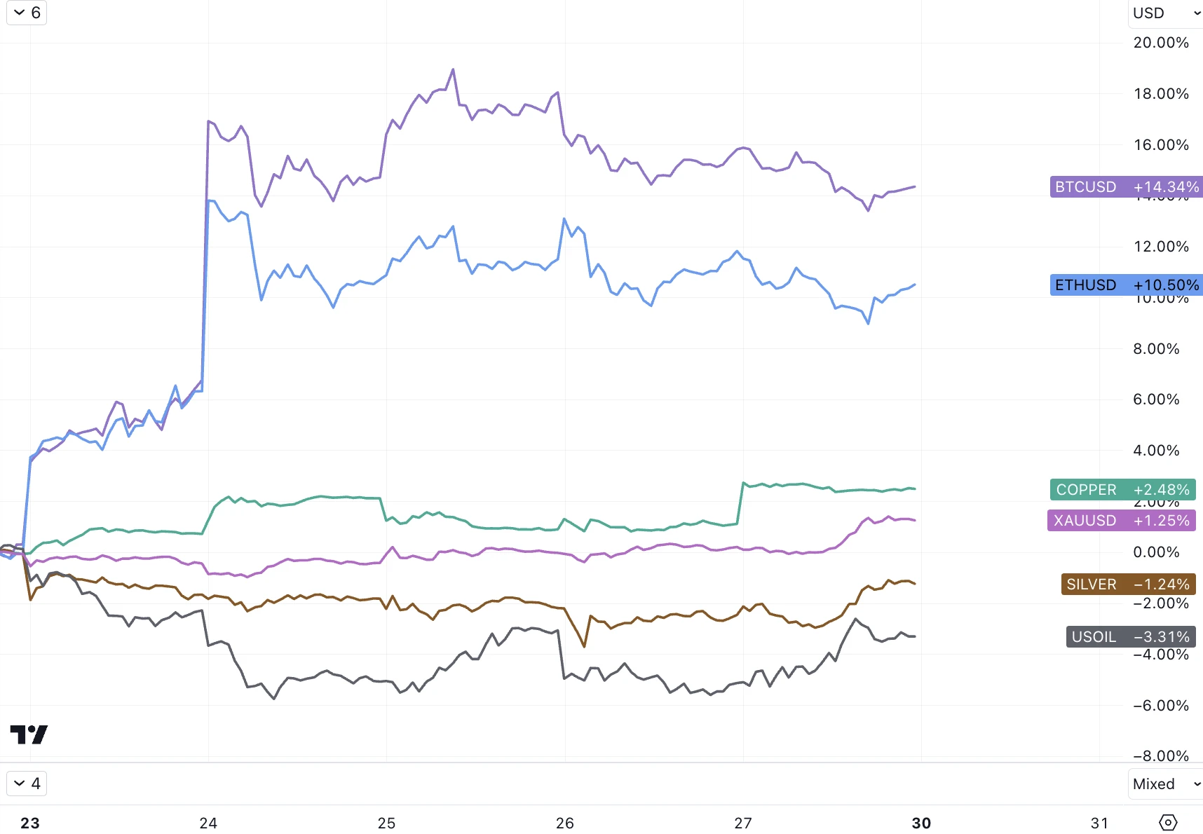加密资产伴随黄金继续大涨,尽管 ETF 方面没有新进展,印证了我们之前的观点,即这一波牛市不只是 ETF 的利好,也是不确定性积累到一定程度下另类资产分散配置的需求,ETF 即便没成可能也影响不大。