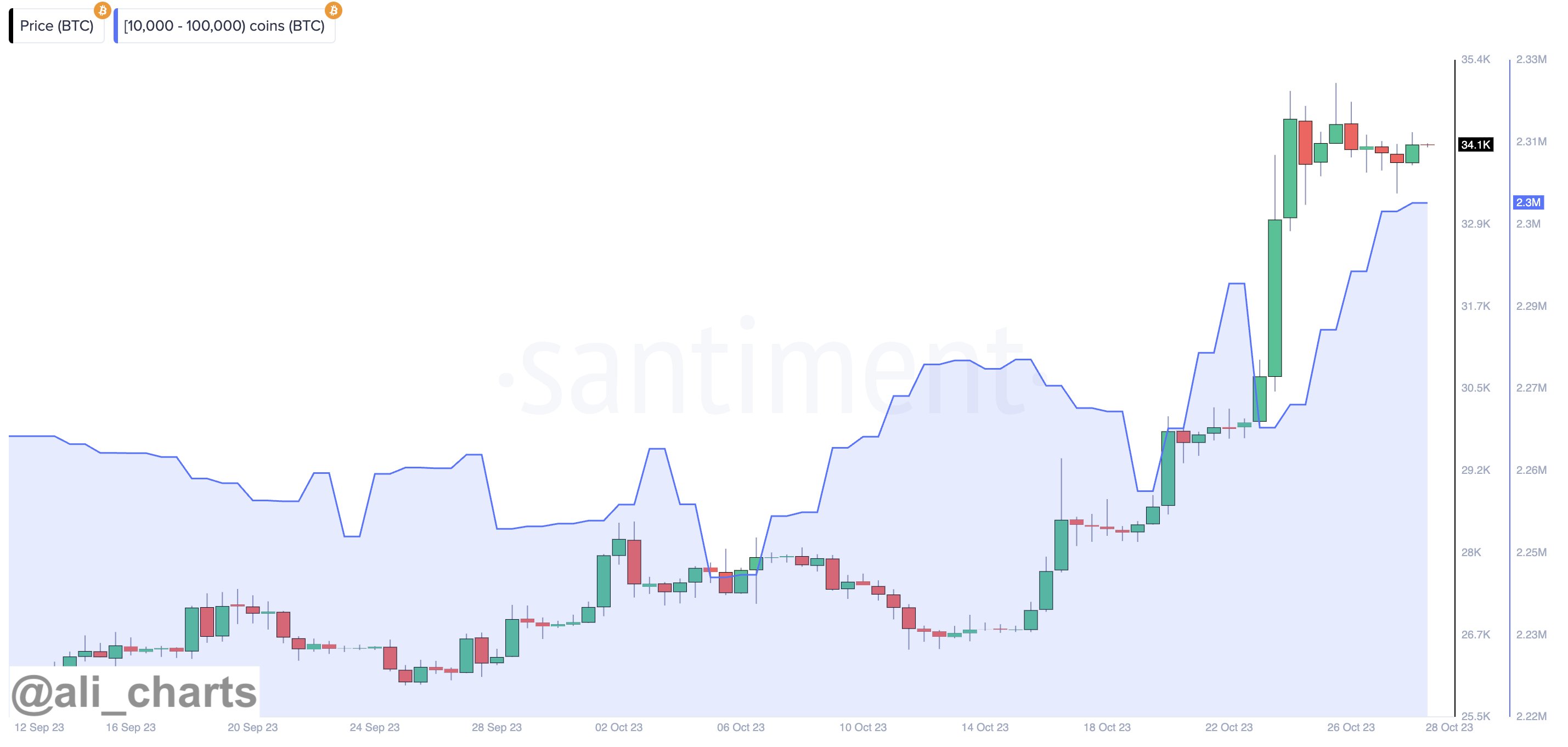 根据U.Today的消息,链上分析师Ali的监测显示,上周巨鲸在五天内累计购买了超过3万枚比特币,总价值约为10亿美元。