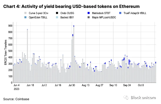 因此,许多代币化资产很难通过去中心化金融 (DeFi) 渠道,如交易自动做市商(AMM) 来找到透明的价格发现。与类似的无 KYC 资产相比,以太坊上的代币化国债活动较弱。见图 4 。例如, Curve 的 DeFi 本地 3 池 ( 3 Crv) 代币市值与 Ondo Finance 的机构级 OUSG 代币化国债相比没有明显的差距(199 百万美元与 140 百万美元),尽管前者持有人数量几乎是后者的 200 倍(也就是说,尽管前者的市值更高,但它却只有 56 个持有者,而后者虽然市值较低,但却有 9254 个持有者)。