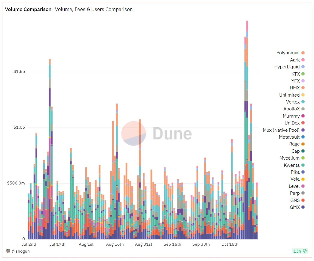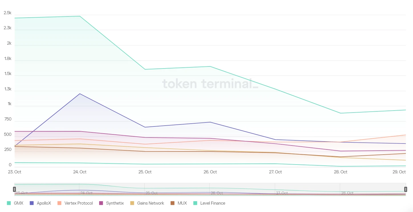 衍生品 DEX 的交易量也有显著的恢复。DYDX 在 10 月 23 日、 24 日的日交易量大约为 20 亿美元左右,此后几天也在 10 亿左右;资金池模式的衍生品 DEX 在高峰期日交易合计也在 20 亿美元左右。DYDX 在交易量上,占据了大约 50% 的市场份额;其后是 GMX 、 Kwenta 、 ApolloX 、Vertex、HMX 等协议。