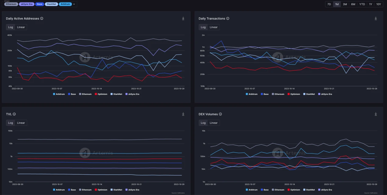 以太坊L2:Layer 2 TVL 总量为 118.9 亿美元,近 7 日整体 TVL 上涨 7.20% 。10.26 日召开以太坊第 173 次 ACDE 会议,会议对坎昆升级的进展和时间表给出了更新,预计主网升级在 2024 年进行。