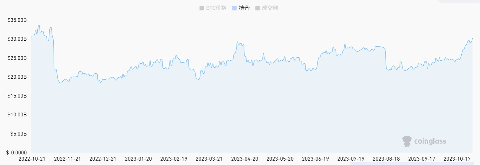 当前合约持仓量为 303 亿美元,已经达到了 2023 年度高点,也接近恢复 2022 年 FTX 事件之间的持仓量。市场经过了将近一年的时间进行修复。