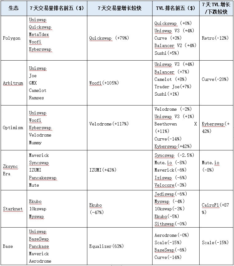 DEX:Dex combined TVL 11.56 billion,较上周增加 600 mln。Dex 24 小时交易量 1.45 billion, 7 天交易量 19 billion, 较上周增加 7 billion。