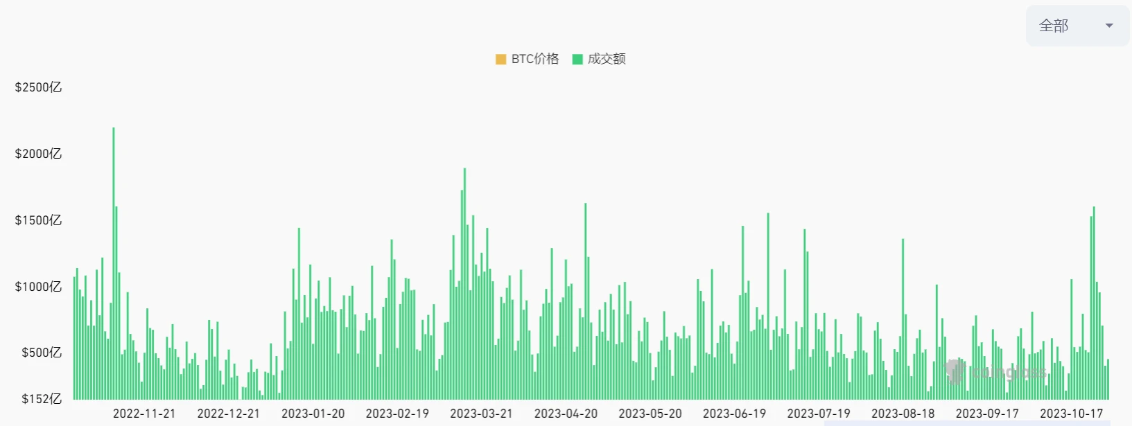 10 月 23 日、 10 月 24 日两日的成交量达到 1500 亿美元以上,属于 2023 年度较高水平。此后几日有所回落,但较此前 8 月至 9 月而言,交易量接近翻倍水平。