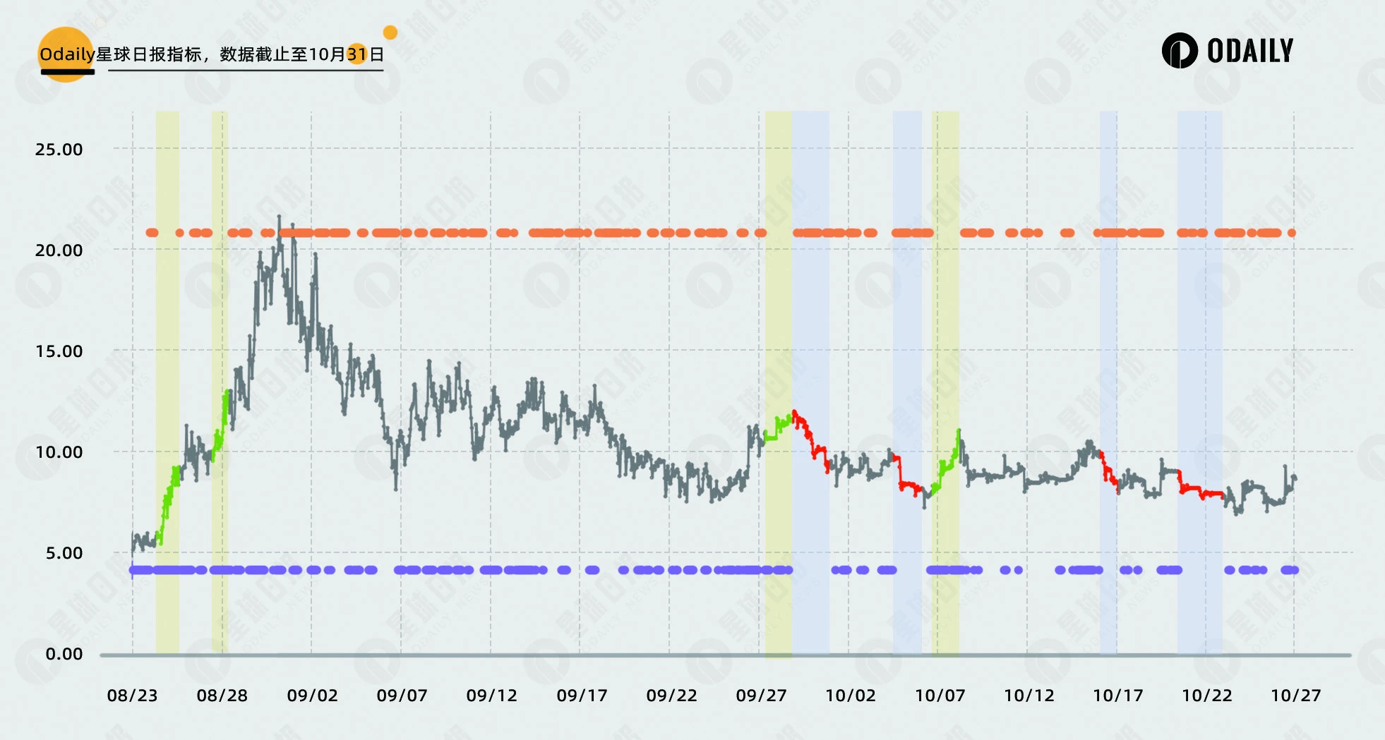 为探究正负溢价与走势的关系,Odaily星球日报将 ﹢3 % 以上溢价记为正溢价(下图橙色), ﹣3 % 以下记为负溢价(下图紫色)。