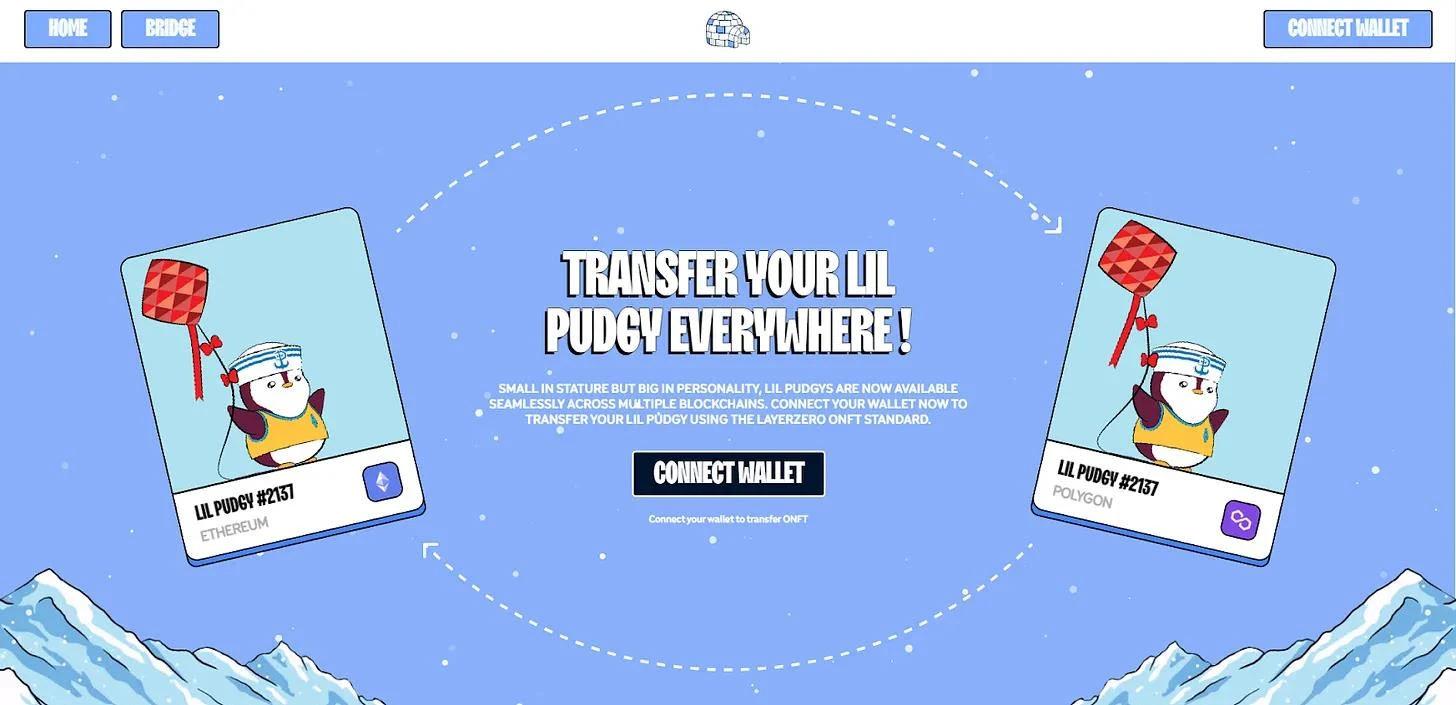 最近流行起来的另一种方法是由互操作性协议 LayerZero 的 全链 NFTs 所推广的"锁定和铸造"。你可能已经在 Lil Pudgys Bridge 中看到过这种方法,它支持向 Arbitrum 、BNB Chain 和 Polygon 的转移。