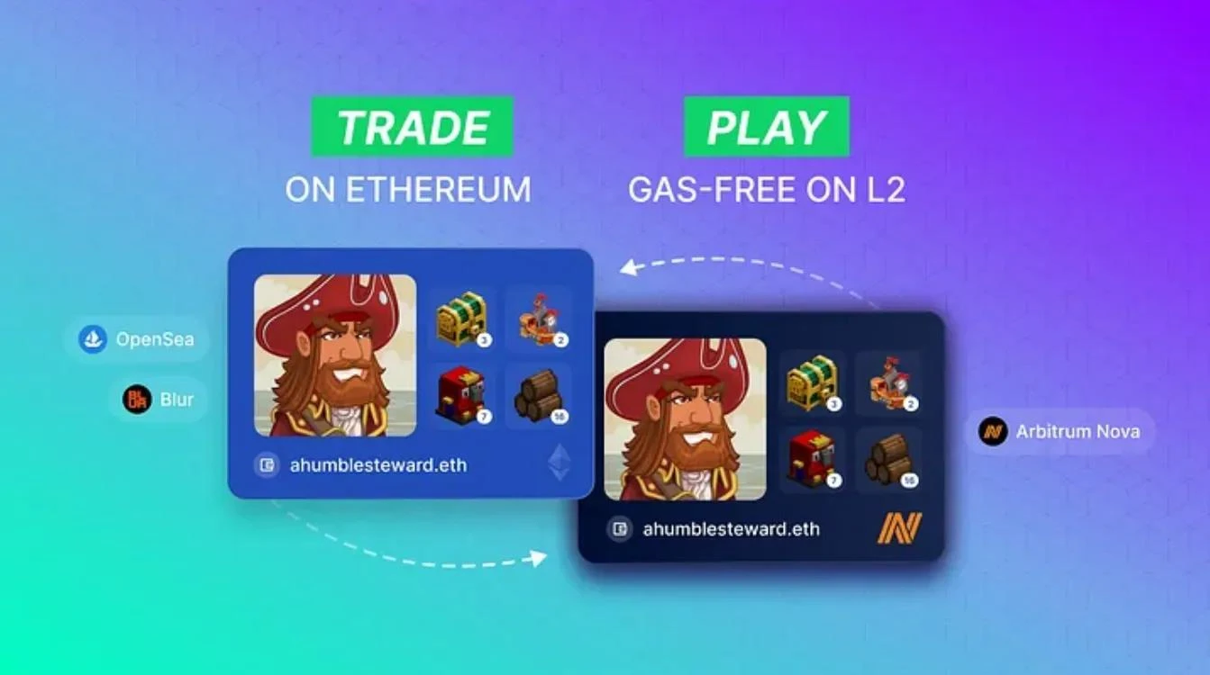 在这方面,我想到了链上 RPG Pirate Nation,因为它开发了一个自定义的"镜像"系统,可以促进" L1 上交易/L2 上游玩 ":原始的创始人海盗 NFTs 保留在以太坊,而它们的镜像在 Arbitrum Nova 上支持无 Gas 费的游戏。