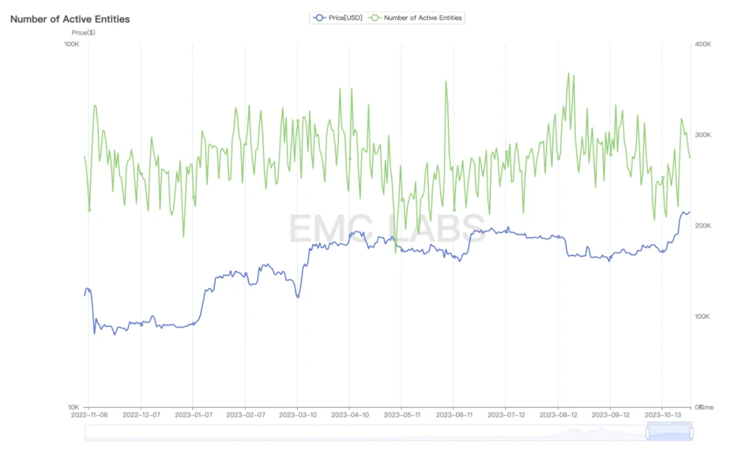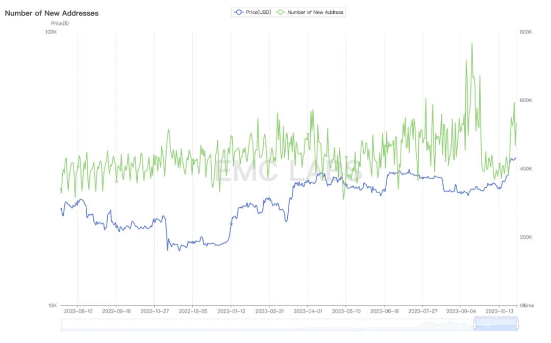 9 月下旬到 10 月中旬,前景不明和市场低迷造成新增地址数据出现了严重的下滑。反弹之后,在投机驱动下链上新增位址实现了快速上升。