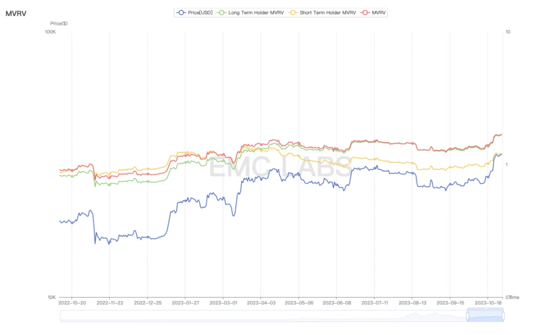 伴随, BTC 在后半月的狂暴上涨,链上 BTC 的盈利状况得到大幅提升。全市场 MVRV(未兑现获利率)达到 68% ,长手(LTH)MVRV 达到 66% ,短手(STH)MVRV 达到 20% 。