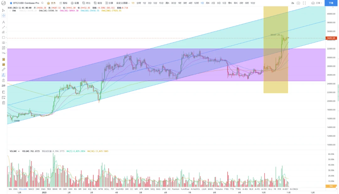 9 月简报中,我们指出 8 ~ 9 月的下探考验时间非常充裕。9 月底市场开始尝试向上,并在 10 月上半月再次进行支撑测试,最终在 15 日开启狂暴上涨模式,在 11 个交易日内将价格由 26000 美元推高至 35000 美元。