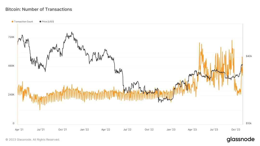 需要注意的是,随着 Ordinals 的兴起,比特网路的数 据结构发生了变化,最近链上活动的退潮与基于 Ordinals 的 NTF 和 BRC-20 Meme 币的投机狂潮消退也有关。