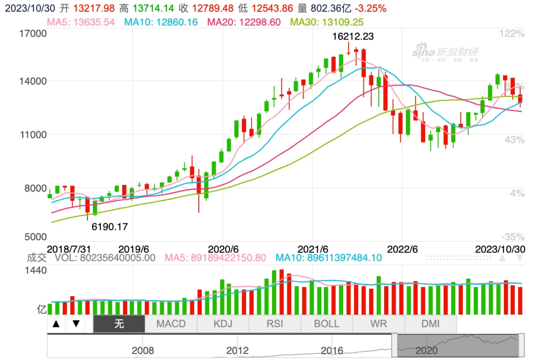 而全球宏观金融市场却并不乐观。纳指继 9 月出现全年最大月度跌幅之后, 10 月再降 3.25% 。11 月不见加息, 12 月会否加息仍存悬念,加之美国经济衰退的论调压力,导致纳指在 AI 炒作热潮消退后连续 3 个月下行,今年以来的反弹升势告一段落。宏观金融市场观望气息凝重。