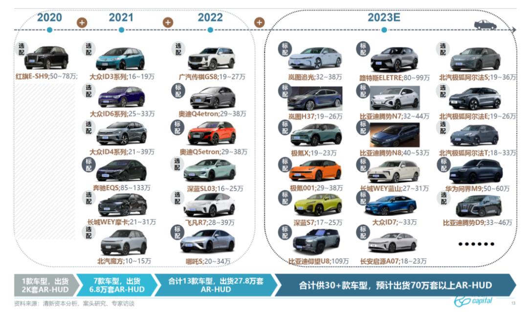 在整体市场表现层面,AR HUD似乎已开启“狂飙”模式,各主机厂纷纷布局AR HUD上车。 截至2023年7月,市场共计30款车型搭载AR HUD,且所装配车型已从早期的30万以上车型逐步下沉至10~20万车型 。