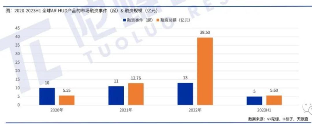 事实上,自2020年5月奔驰全球首发量产AR HUD产品后,资本就以逐年上升的趋势涌入这个赛道。 根据陀螺研究院的数据统计,2020-2023年上半年期间,全球共发生39起投融资事件,规模达63.41亿元,融资事件和总规模呈现逐年递增趋势 。
