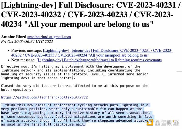 在此之前,闪电网络安全研究员和开发人员 Antoine Riard 在一封邮件中,深入探讨了闪电网络通道所面临的资金丢失风险,这些风险主要是由于交易池的替换循环攻击问题引发的。他特别提到了一种影响闪电网络通道的交易中继干扰攻击,这在实践中是完全可能的,即使没有网络交易池拥堵也可能发生。