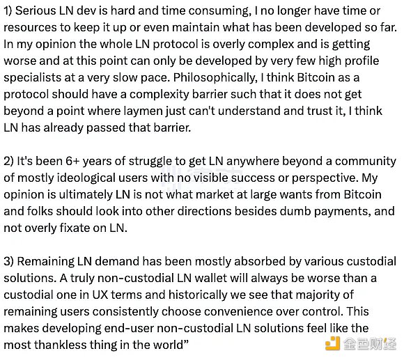 1. 严肃的闪电网络开发既困难又耗时,整个闪电网络协议过于复杂,而且越来越糟,在这一点上,只有极少数知名专家才能以非常缓慢的速度开发。从哲学上讲,我认为比特币作为一个协议应该有一个复杂性障碍,这样它就不会超过外行人无法理解和信任它的地步,我认为闪电网络已经通过了这个障碍。 2. 经过 6+ 年的斗争,闪电网络超越了一个主要由意识形态用户组成的社区,没有明显的成功或观点。我的观点是,最终闪电网络并不是整个市场对比特币的期望,除了愚蠢的支付之外,人们应该寻找其他方向,而不是过度关注闪电网络。 3. 剩余的闪电网络需求主要被各种托管解决方案所吸收。在用户体验方面,一个真正的非托管闪电网络钱包总是比托管钱包更糟糕,从历史上看,我们看到大多数剩余的用户始终选择便利而不是控制。这使得开发最终用户非托管 闪电网络解决方案感觉像是世界上最吃力不讨好的事情。」