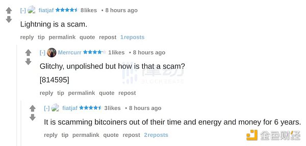 「闪电是一个骗局,」在 Blockchair 首席开发人员 Nikita 分享的一张屏幕截图中,Nostr 创始人 Fiatjaf(@fiatjaf),在评论中,另一位用户同意闪电网络是「故障」和「未经打磨」的,同时追问 Fiatjaf,为什么这是一个骗局。