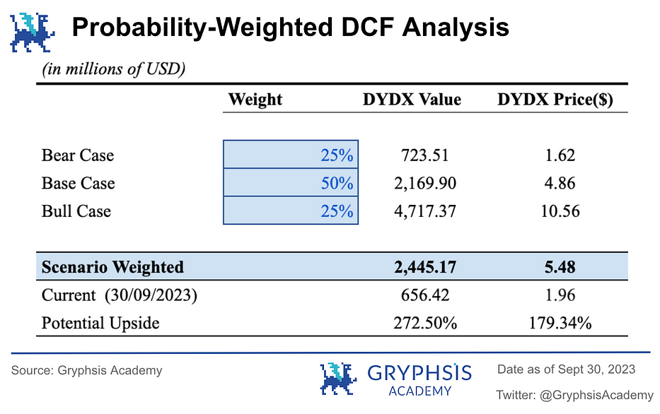 我们分别分配给牛市和熊市 25% 的概率,基准情景 50% 的概率。经计算,DYDX 价格的概率加权 DCF 估值为 5.48 美元,协议的估值为 24.45 亿美元。而 2023 年 9 月 30 日的 DYDX 价格为 1.96 美元,因此 DYDX 有 179.34% 的潜在上涨空间。