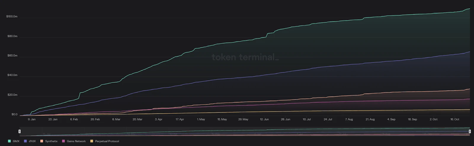 以上是这五个项目截止 2023 年 10 月 27 日的年度累计收入比较图,从图中可以看出,GMX 的项目收入最高,是这五个中唯一的一个收过超过了 1 亿美金的项目,dydx 的收入次之,达到了 6540 万美金,Perpetual Protocol 的收入最低,为 6300 万美金。